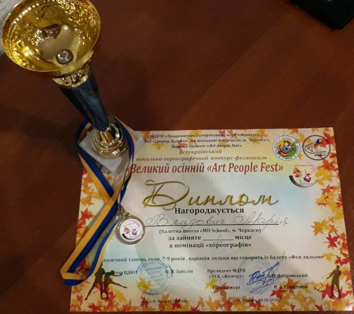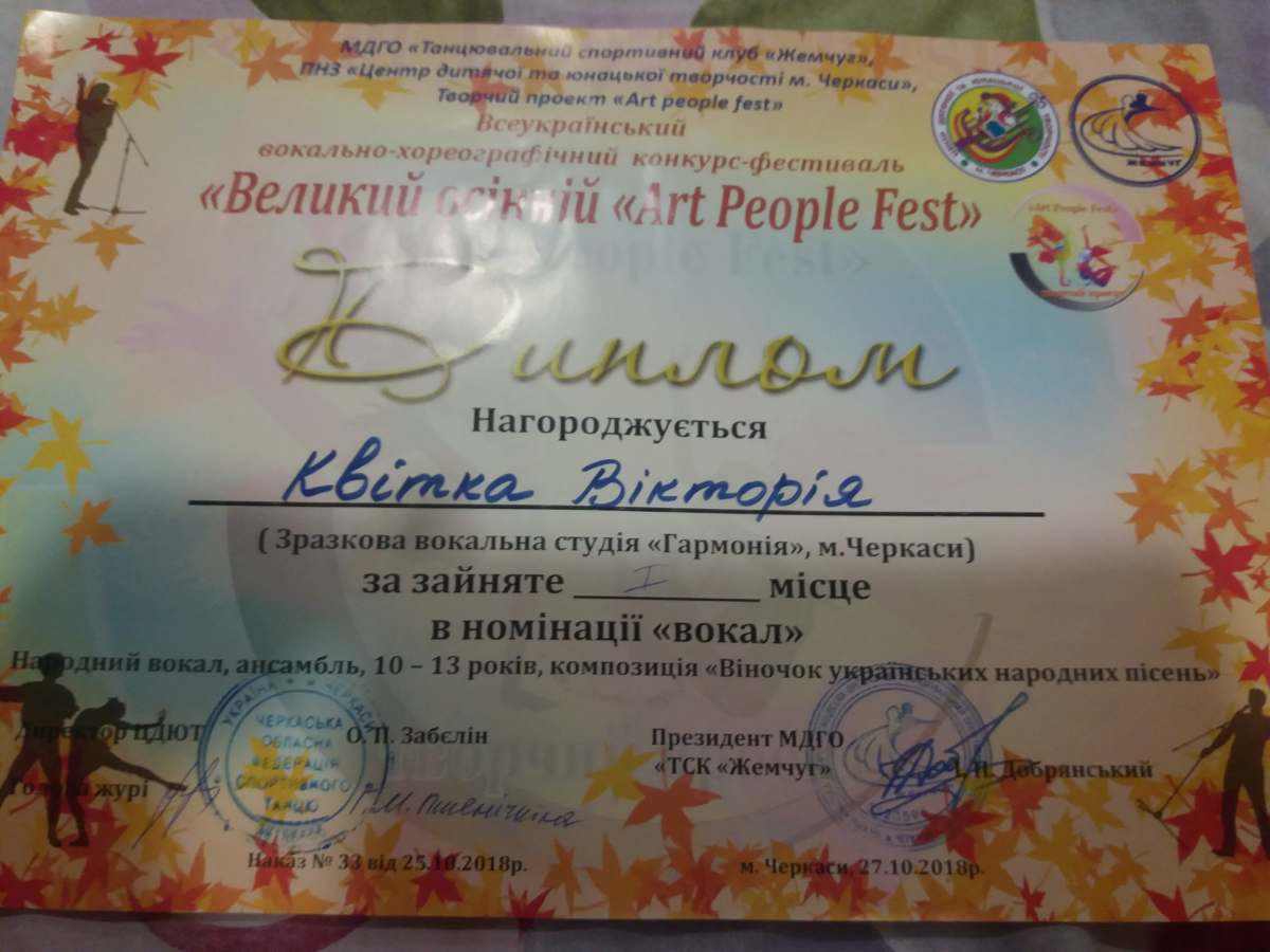 Вони брали участь у Всеукраїнському вокально-хореографічному конкурсі-фестивалі «Великий осінній «Art People Fest» і посіли перші місця в номінаціях «Хореографія» та «Вокал». Бажаємо, щоб кожен наступний крок до вершини ви ступали впевнено і з вірю в те, що вам це під силу.