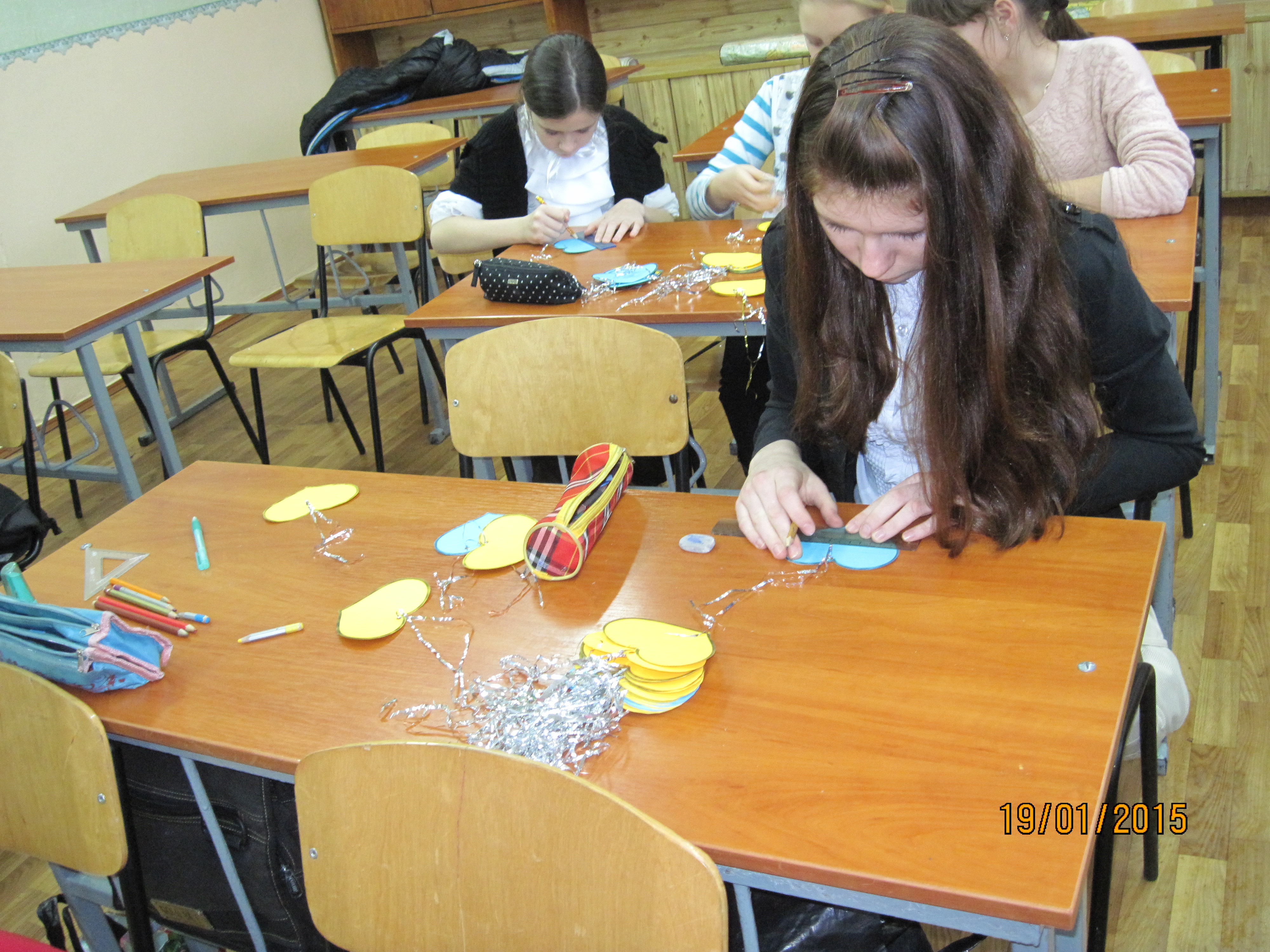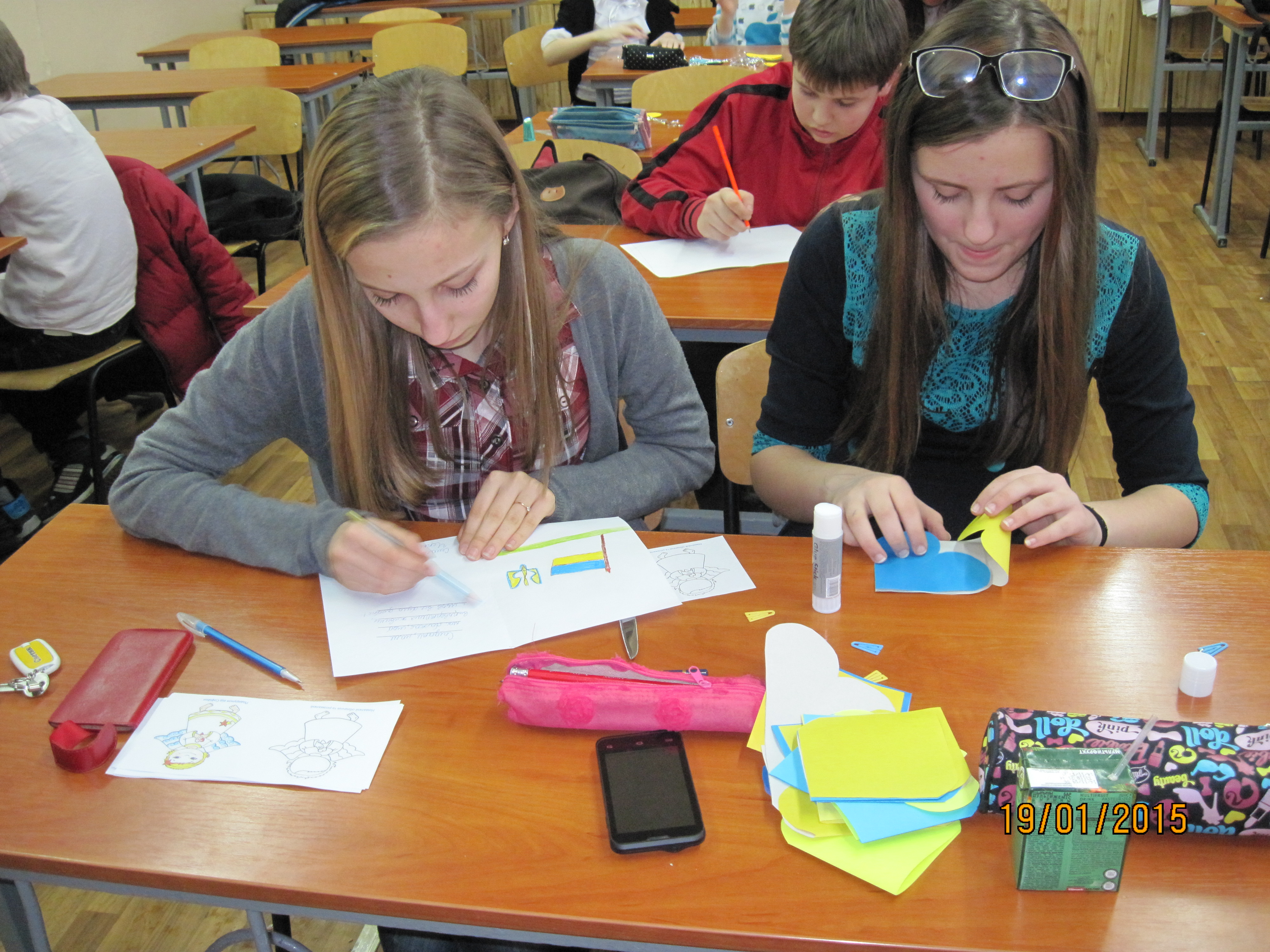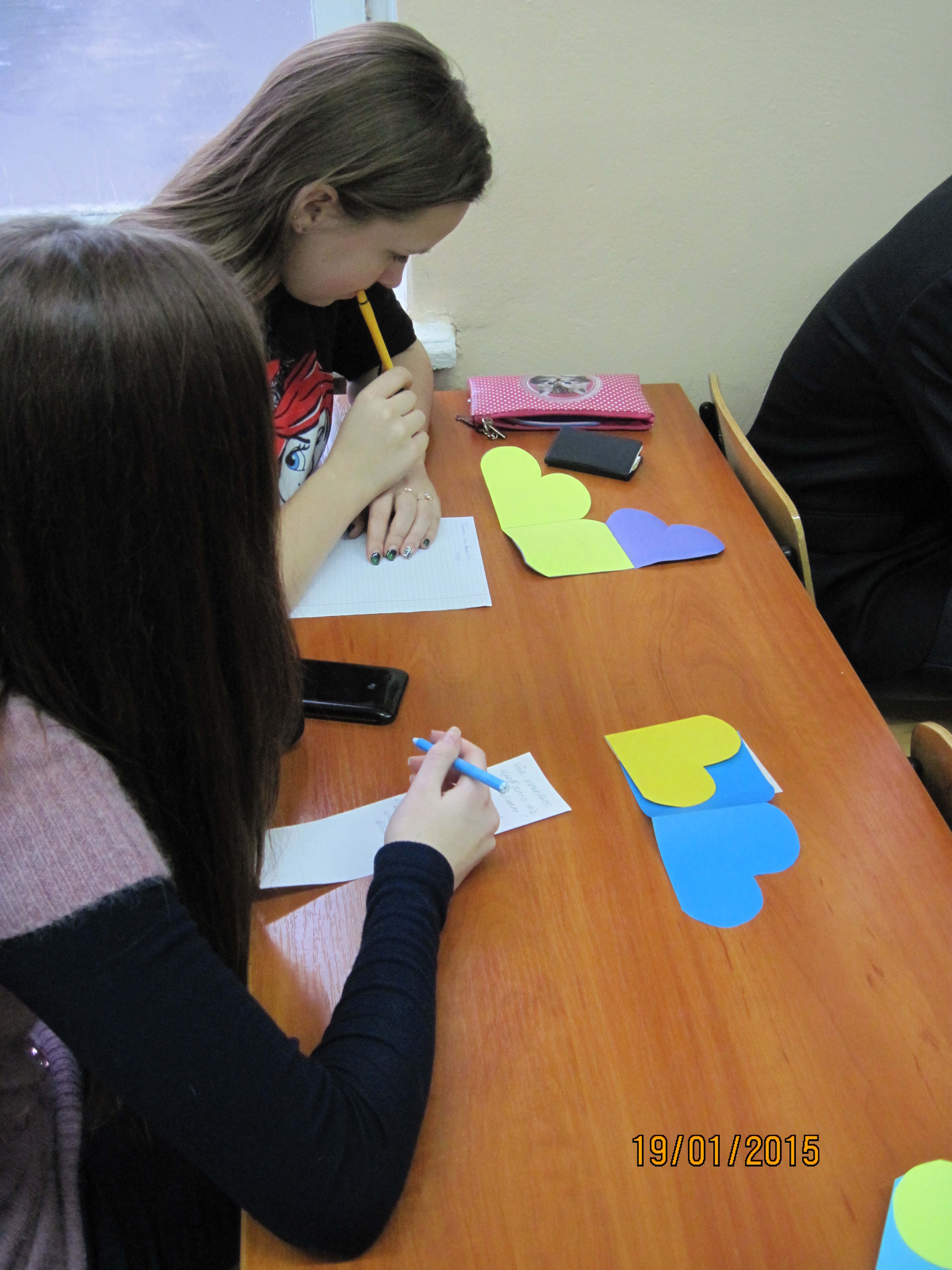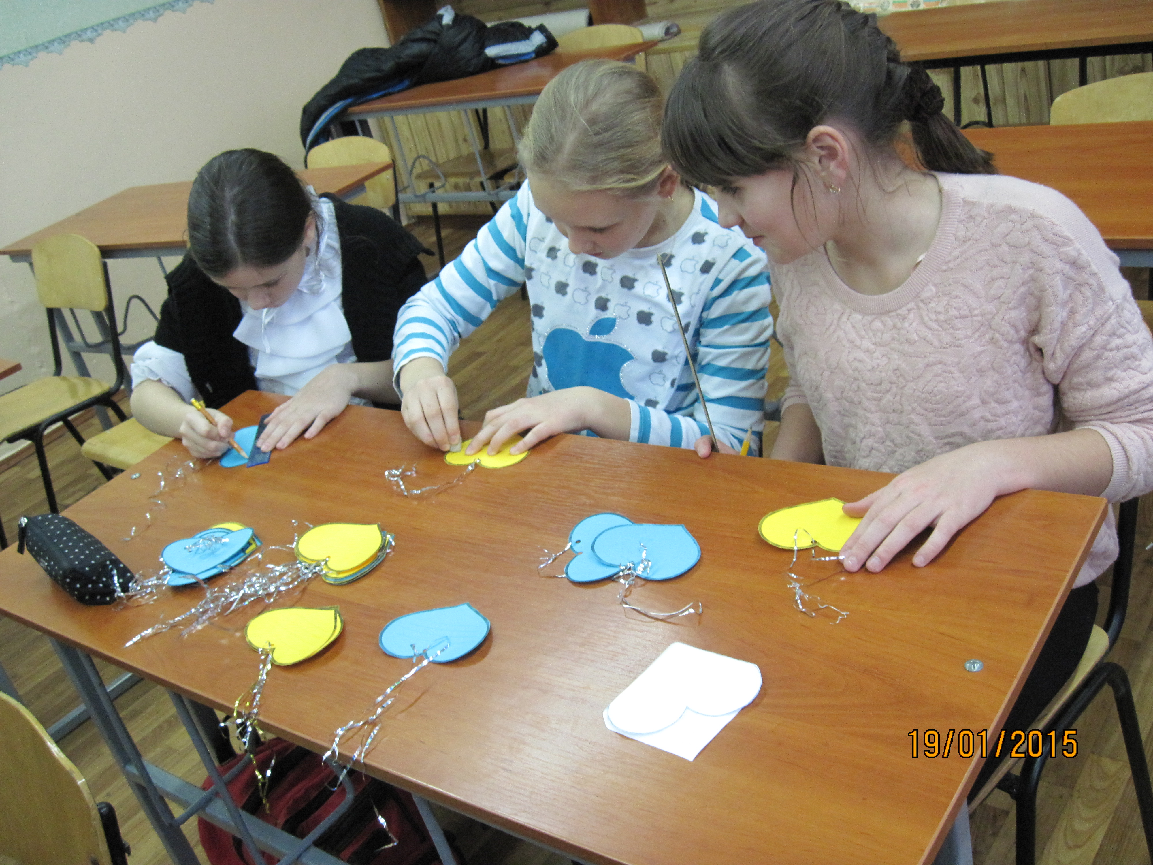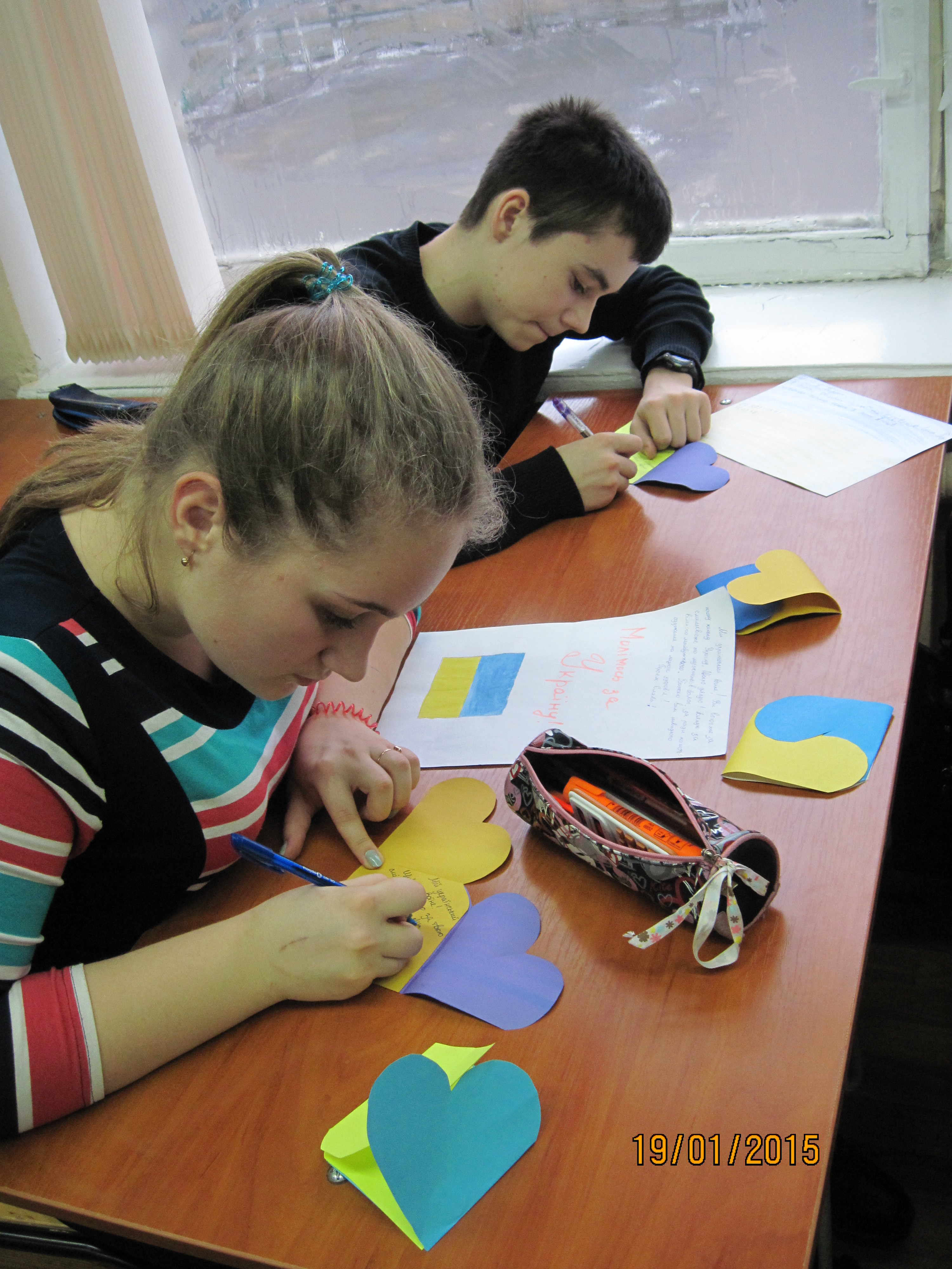 IMG_064919 січня учні школи на чолі з заступником директора з виховної роботи Українець Інною Костянтинівною писали листи та малювали малюнки для підтримки наших солдатів у зоні АТО. Слова вдячності вони висловлювали на символічних серцях, створених власноруч.