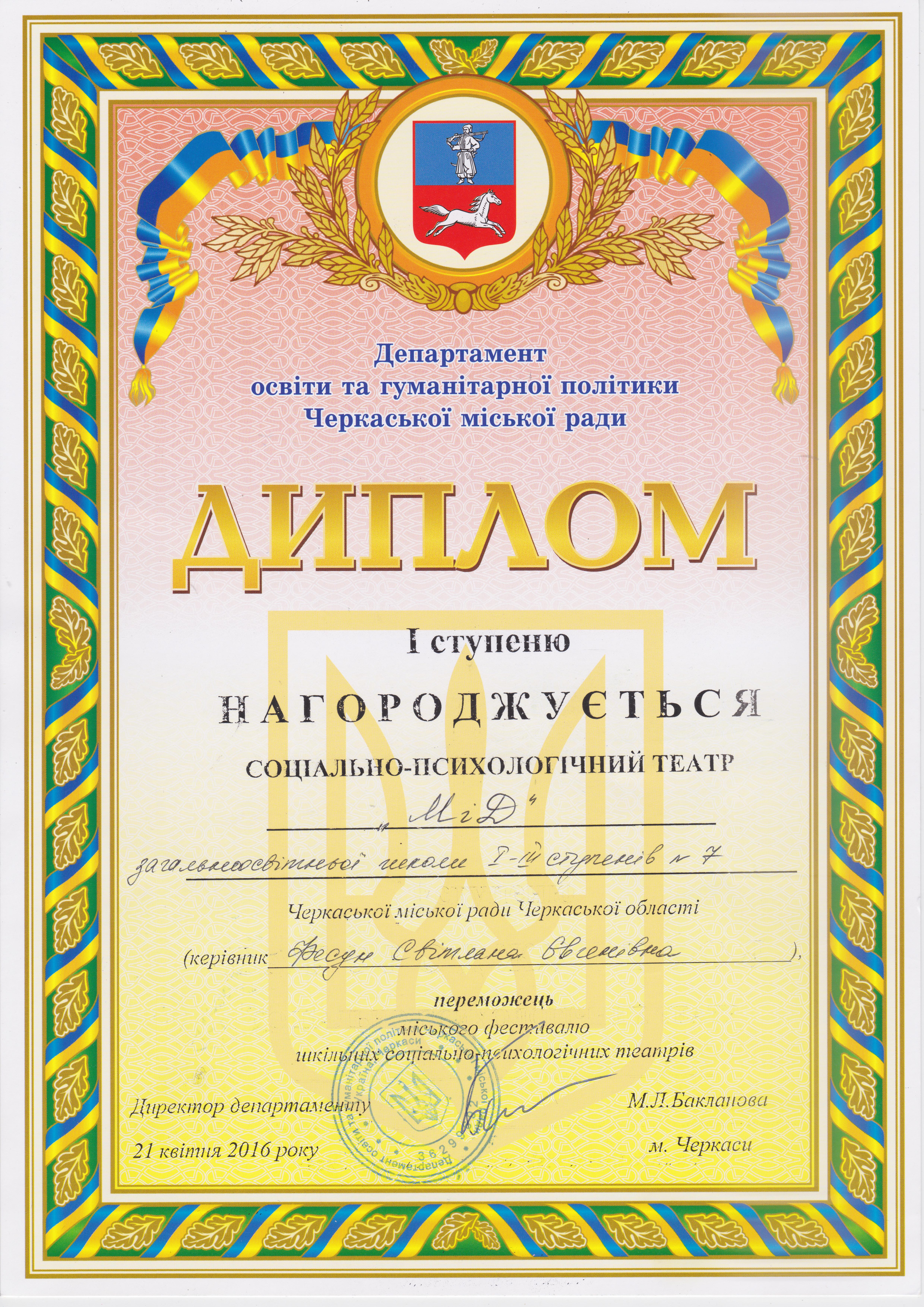 посів І місце в міському фестивалі соціально-психологічних театрів.  Дякуємо учасникам за їх креативність та бажаємо подальших творчих успіхів. Також висловлюємо подяку Бондаренко Анні, Вискварці Ірині та Прокопенко Тетяні за допомогу в організації виступу театру.